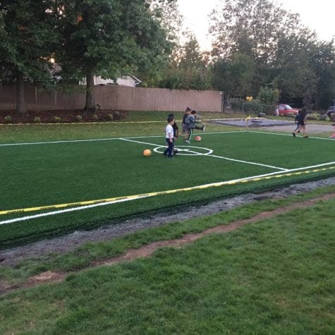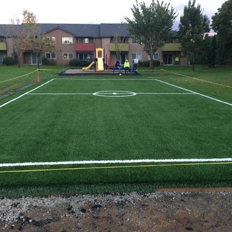 We worked with Prograss to create a miniature soccer field for the kids to enjoy at a local apartment complex. As you can see the kids could hardly wait to get on the turf field and play!